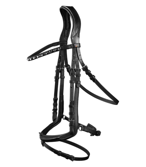 Anatomická uzdečka z pravé kůže. Kombinace nánosníku s podpínkou. Nátylník je anatomický pro větší místo za ušima, měkkce vypodložený. Elegantní čelenka s kamínky. Tvar nánosníku je zaoblený pro větší místo v oblasti lícních kostí. Dodávaná včetně web klasických otěží 19mm.