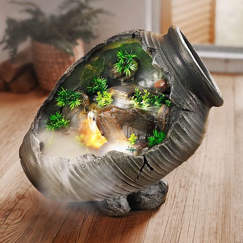 V této amfoře ožívá malý svět fantazie. Tiché šumění tekoucí vody je ozářeno teplým světlem a chuchvalce mlhy dodávají idyle mystickou atmosféru. Tento nádherný dekorační doplněk ve vašem domově během chvilky rozproudí relaxační atmosféru, vodní tok má pozitivní vliv na klima v místnosti. Dekorativní amfora z litého kamene, uvnitř přírodní skalní krajina (litý kámen) s dekorativními rostlinami (plast). Integrované osvětlení se 2 teplými bílými diodami LED. Včetně vodního čerpadla, síťový provoz, 5 m přívodního kabelu. Včetně samostatného mlhovače s LED diodami, provoz ze sítě (je umístěn uvnitř ve vodě). Velikost amfory, d x š x v: 35 x 25 x 32 cm. Vhodné pro provoz v interiéru.